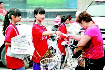 在东昌路上,王婷婷、王琪璇两人向路人推销报纸。 本报记者 李军 摄