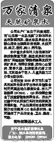 公司生产厂址位于风景秀丽,有“山东第一生态名镇”之称的泗水县泗张镇南陈,源水取自泉林水系群山深处的碳酸盐岩岩隙,水质天然、纯正、清冽、爽口、无污染。 水中富含多种对人体有益的矿物质和微量元素,属自然界较为独特的“高锶低钠”碳酸钙镁型优质天然矿泉水,有强壮骨骼、防治心血管病、营养大脑、加速新陈代谢之功效,尤其适合于老人、儿童及脑力工作者长期饮用。 公司投资2000多万元引进了具有国际先进水平的净水处理和全封闭无菌自动化灌装设备,并且严格按照ISO9001、QS标准建立健全了质量管理和保障体系,在生产过程中对水质进行实时在线检测及消毒处理,产品包装采用全新无毒副作用的美国GE食品级材料,全面确保了产品的安全、卫生、稳定、可靠。 常年招聘送水工人 济宁供水集团荣誉出品 厂址:泗水县泗张镇南陈 服务电话:2285066 2285099