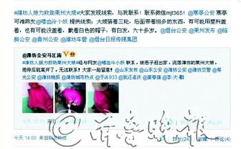 网友拍摄的照片及微博截图。 本报7月22日讯(记者 赵磊)7月20日,潍坊一位网友发微博:“莱州的大娘被儿子赶出家门,自己骑三轮车到了潍坊,到她家中讨饭吃,随后离去,无法联系。”该微博被众多网友转发,网上接力帮助一起寻找“莱州大娘”,本报也联动潍坊和烟台两地同步进行报道,寻找“莱州大娘”和她的家人。 “莱州的大娘,自己骑着三轮已经到了潍坊。外面下着大雨,看来大娘是饿了,来我家讨了点饭。”7月20日上午10点32分,网友“噬血冷小妖”发布微博,并附带有三张“莱州大娘”的照片。从照片上看,“莱州大娘”年龄在60岁左右。大娘骑着三轮车,后面带着挺多东西,有可能用塑料盖着,戴着白色的帽子,有白发。 微博一经发出,引起了不少网友的关注。7月21日,潍坊公安的微博达人@潍坊公安马江涛在网上发起了“潍坊人接力救助莱州大娘”的活动,并得到众多网友的响应,他发布的数条微博在短短半天时间内,被转发多达200余次。 马江涛称,他已经与网友“噬血冷小妖”联系,网友的家在寒亭区。但是,流落潍坊的“莱州大娘”在雨停之后就已经离开了,目前无法联系。 7月21日,记者联系到了马江涛。马江涛说,微博发出之后,潍坊市公安局也及时介入这次爱心救助的行动中。潍坊市公安局调度各个城区的巡防车,寻找“莱州大娘”;同时寒亭公安分局和潍坊交警部门也发出指令,帮助寻找。 “这次活动也反射出潍坊网友的积极救助的正能量。“马江涛说,众多微博转发这次爱心救助,更多的市民参与到其中。然而,可惜的是,到现在为止并没有接到有关莱州大娘的有效线索。据悉,莱州市公安局已经与潍坊公安取得联系,他们也希望能够尽快寻找到这位“莱州大娘”。找到大娘后,他们将会负责接大娘回家,并联系其家人将其安顿。本报今日烟台也发出报道,在当地寻找这位大娘的亲人。 请广大市民一起留意,如果见到这位“莱州大娘”,请马上与本报联系,或者微信联系马江涛的微信(mjt365),让我们一起帮助这位老人。本报会继续关注寻找“莱州大娘”的最新进展。