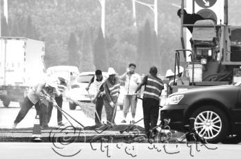 22日,三八路与康博大道路口,市政人员正在修整路面。站在高温的沥青旁工作,如同靠近蒸笼一般。