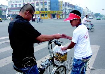 | 在十字路口,看到等红灯的市民,小报童刘嘉男就会跑上前去卖报。 见习记者 陈兰兰 摄 |