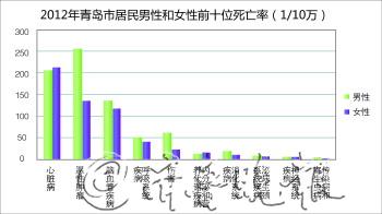 2012年青岛市居民死亡前十位死因依次为心脏病、恶性肿瘤、脑血管病、呼吸系统疾病、伤害、内分泌和营养及代谢的其他疾病、消化系统疾病、泌尿生殖系统疾病、神经系统疾病及传染病和寄生虫病。