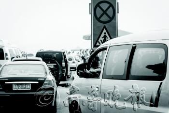 22日,在五四广场,一处禁停标志下停了一排私家车,其中一位司机甚至将脚伸出窗外按摩起来。进入旅游旺季,五四广场上常有游客在路边乱停车,给其他想要合影留念或穿行广场的游客带来不便。