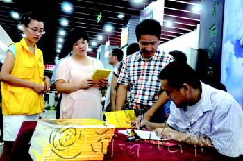 图为周飞正在为自己的读者签售《轮椅上的飞翔》。