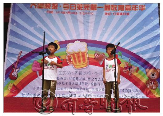 ▲梦之音学校的扬琴表演引人入胜。 见习记者 于鹏飞 20日下午,“齐鲁晚报·今日莱芜第一届教育嘉年华”在莱芜市红星建材城广场闪亮登场。美轮美奂的舞蹈绽放舞台,集体朗诵铿锵有力、掷地有声,古筝、扬琴独奏惟妙惟肖,儿童宝贝们才艺顶呱呱,在现场掀起一轮又一轮的高潮。 学校参与热情高涨,节目出彩又新颖 此次教育嘉年华吸引了莱芜当地知名度高、培训教学能力强的艺术培训学校热情参与,教育嘉年华,蓝话筒少儿主持人培训学校、梦之音艺术学校、ABC双语幼儿园、翰林写作莱芜中心、晓雪艺术学校、红舞鞋舞蹈培训中心等一些艺术培训学校都在活动中一展风采。 “少年智则国智,少年富则国富;少年强则国强,少年独立则国独立······”蓝话筒少儿主持人培训学校几十位优秀小学员齐声朗诵《少年中国说》,学生们吐字清晰、普通话流利标准,铿锵有力的朗诵声响彻云霄,博得了台下家长及现场观众的阵阵掌声。其中,不乏有观众为小朋友的精彩演绎竖起大拇哥。梦之音艺术学校带来的扬琴独奏《红莓花儿开》、《南疆舞曲》,演奏串烧《最炫民族风》、《月亮代表我的心》,学员们将悠久地古典乐器与现代流行乐完美融合演出,家长们纷纷用相机扑捉孩子表演瞬间,记录下他们成长、成才的每一步。 蓝话筒培训学校郭老师接受记者采访时说:“今天来了40个学生,将参演6个节目,像快板、相声、绕口令都是老师原创编排,针对学生不同年龄阶段学校有差异性的培养目标,比如面向四年级学生的中英文双语主持就填补了莱芜教育的空白。” “今天不少新学员都是看过报纸才来的,有些家长领着孩子看了展演后当场就报了名,明天就可与参演的小伙伴们一块训练。”一艺术培训学校老师介绍道。 来自梦之音艺术学校的扬琴、古筝、二胡表演让人赏心悦目,扬琴版的“神曲”和“情歌”都让人过耳不忘。记者在采访梦之音艺术学校校长亓文娟时得知,梦之音历届学员中大多都考上了理想的艺术院校。其中不乏山东艺术学院等知名院校。这次活动中优雅的古典乐器表演让很多孩子跃跃欲试,现场报名、咨询不断。 演出高标准,家长忙得不亦乐乎 两天的教育展,更是难挡家长们的热情,他们不断地前来咨询培训班上具备哪些独特的教学管理模式,师资力量如何,孩子身上的天赋如何得以挖掘等话题。 市民闫先生今天特意来观看儿子现场主持,用闫先生质朴的话就是“给小孩加加油、打打气、鼓鼓劲”。“孩子到蓝话筒学了将近1年了,进步成长确实挺大的,经常去临沂、济南等地参与演出,现在独立性也明显强多了,学主持也是他最大的爱好,做家长一切顺其自然,从来不强求他学这学那。”闫先生说道。两位小主持人闫格和彭宇斐与本报记者魏晓燕和蔺相虹两个大主持人组成的主持团队让人眼前一亮,熟练的普通话,落落自然的台风,让观众拍手叫好。彭宇斐说:“我们跟着郭老师学的,我还要继续加油。” 记者观察发现,有些家长直接带孩子请教培训老师指点迷津,梦之音的老师边打节拍边指导学生操作古典乐器。“暑假孩子业余生活多了,不能在家疯玩,锻炼一下才艺,也陶冶了情操,当家长的也放心,你们这个教育展搞得真不错。”贾心钰的奶奶对记者说。 在教育展上,有些家长甚至针对孩子性格制定出成长规划。“明天孩子将去济南参加全国少儿主持人大赛了,今天前来演出算是预备演出吧,做到心里有数,今后将适度引导孩子往主持方向靠,毕竟孩子爱这一行。”家长陈女士说道。 由本报打造的教育嘉年华活动经过两天的完美演出,给莱芜市民奉献了一场现代教育的饕餮盛宴,家长和孩子们都在期待下一届的精彩。 教育嘉年华现场火爆,所有的节目包括小主持人都来自于各个培训学校,精彩的节目吸引了大批观众驻足观看,不仅小朋友们看的入迷,就连大人也看得津津有味。 双胞胎兄弟 口才好 20日下午,记者在展演现场看到,穿着演出服的选手们正有条不紊地表演着。在众多选手中,一对可爱的双胞胎兄弟将相声《反正话》表演地绘声绘色,其幽默诙谐、令人捧腹的脱口台词,博得了台下观众阵阵喝彩。蓝话筒培训学校张老师介绍:“这对双胞胎兄弟,哥哥叫孙翰城,弟弟叫孙翰林,今年同为6岁。
