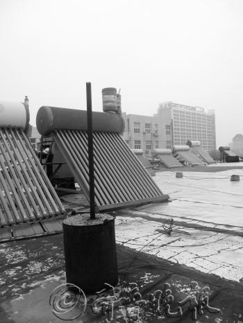 张店华光路某小区避雷针已经生锈,楼顶的太阳能热水器多高于避雷装置。 本报记者 张汝树 摄