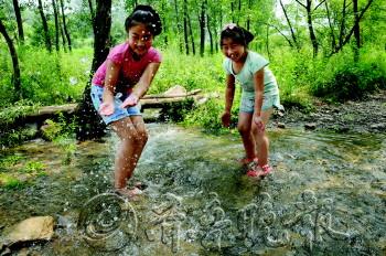 | ◤淄川区太河镇西余粮村的晨晨和小青在小溪边开心地玩水。 本报记者 姜文洁 摄 |
