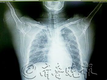 记者看到老曲的胸部CT,在他的右侧锁骨处有一根呈“7”形的金属物,长约7厘米,尖端直指心脏方向。“4年前丈夫被重物砸中右侧锁骨,致右侧锁骨骨折。”彭女士介绍,当时打进三根钢钉,两个月后到医院取钢钉时,有一根拔不出来,就一直留在了里面。 “当时医生说,留在体内也不会有影响,所以我们就没在意。”彭女士说,直到毓璜顶医院医生将CT片子展示给彭女士看时,她才回忆起这根被遗忘的钢钉。 对此,毓璜顶医院创伤骨科主任王新介绍,骨折受伤后这根钢钉虽然发生游走,但可以看出当初钢钉打入位置不正。但即使再难取,当时的医院也应想办法取出,否则留在体内时间过长,会发生移位。