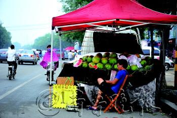 | 23日下午,市区一西瓜摊前,打出了1元一斤的招牌。