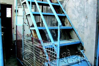 | 万安路一纸箱厂的楼梯下,一只德国牧羊犬被养在铁笼中。 曹思扬 摄 |