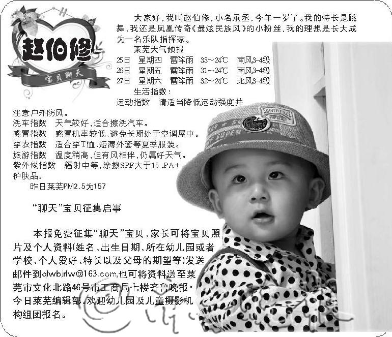 大家好,我叫赵伯修,小名承丞,今年一岁了。我的特长是跳舞,我还是凤凰传奇《最炫民族风》的小粉丝,我的理想是长大成为一名乐队指挥家。 莱芜天气预报 25日 星期四 雷阵雨 33~24℃ 南风3-4级 26日 星期五 雷阵雨 31~24℃ 南风3-4级 27日 星期六 雷阵雨 32~24℃ 北风3-4级 生活指数: 运动指数 请适当降低运动强度并注意户外防风。 洗车指数 天气较好,适合擦洗汽车。 感冒指数 感冒机率较低,避免长期处于空调屋中。 穿衣指数 适合穿T恤、短薄外套等夏季服装。 旅游指数 温度稍高,但有风相伴,仍属好天气。 紫外线指数 辐射中等,涂擦SPF大于15、PA+护肤品。 昨日莱芜PM2.5为157