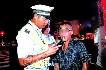 25日晚,芝罘公安分局在全区开展治安大清查。民警分别对市区旅馆、网吧及夜市等场所进行检查,同时巡警大队在火车站、二马路等市区5个重点路段设卡检查过往车辆。图为晚上8点30分,在二马路虹口大酒店附近,一名男子经过酒精测试仪检测,仪器显示血液中酒精含量达到56mg/100ml,构成饮酒驾驶。 本报记者 韩逸 侯艳艳 摄影报道