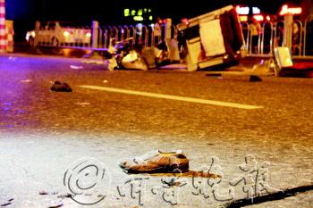 本报7月25日讯(记者 张建业) 25日晚8点10分左右,在东方红路高地世纪城附近,一辆从东向西行驶的大众途观汽车,将一辆电动三轮车撞翻,三轮车上的两位老人一死一伤。 事发地点在正对着高地世纪城大门马路隔离带开口处。围观的群众说,当时电动三轮刚刚从开口处穿过,便被高速驶来的汽车撞飞。在现场电动三轮车部件撒了一地,甚至老人的一些鞋子等衣物也在地上散落着,在离三轮车四五米的地方,还残留着一大滩血迹没有清理,肇事车辆左前方损毁比较严重。 之后赶来的救护车将两位老人进行了一番检查,救护车拉走了老太太,她的老伴装到黄色袋子被拉走。现场一直未见老人的亲属。 晚上8点52分左右,警方做好现场取证后,救援车辆前来将电动三轮拉走,途观车也随之离去。事故原因正在进一步调查中。 (奖励线索人王先生 50元)