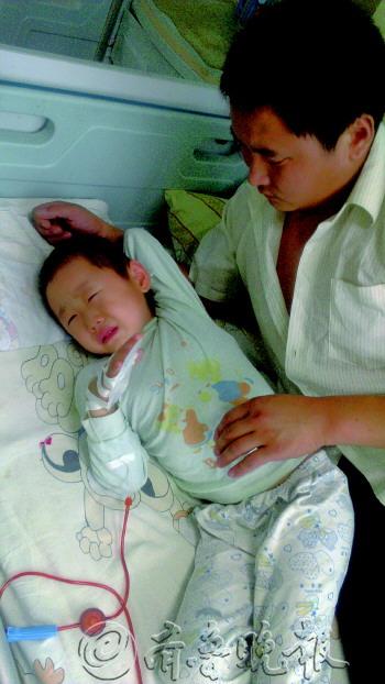 本报菏泽7月25日讯(记者 张园园) “为什么要给我打针呀?”25日下午3点多,在齐鲁医院儿科病房里,看到护士进来给自己打针,5岁的胡奥航偎在爸爸胡永峰的怀里哭了起来。近期,本报独家报道为给患白血病的5岁孙子筹手术费,年逾花甲的老汉胡金起街头冒雨卖瓜,并发出爱心倡议,得到爱心市民响应。25日,记者奔赴济南,探望了病中的胡奥航。 “到明天(26日),就在这儿住一个月了。”胡永峰说,这一个月里,他们每天的日程安排几乎一样:上午9点多,小航航开始打针输液,一直到下午三四点甚至五六点钟。 “不敢出去,怕他感染。”不到十平米的病房就是小航航的活动空间,胡永峰说,一方面是不敢让他出去,另一方面是他“没精神、没气力,也不愿意出去”。 2012年查出患有白血病后,小航航就开始接受化疗,一个月最少住院一个周几乎成了他的正常生活。“他知道自己得了什么病,但他太小,根本不知道这个病会有什么样的后果。”胡永峰说。 胡永峰介绍,得知小航航患白血病,孩子母亲连着哭了好几天,“哭也不管用啊,有病还得看,自己孩子,谁也不舍得不给他看。”而之后的四处求医更是花光了家中所有的积蓄。 说起钱,这个30岁的男人有些不想多说,只是一个劲儿地叹气,“以前他妈妈带着他四处看病,我在外打工挣钱,挣一点算一点吧!”得知亲兄弟姐妹的脐血配型成功的可能性比较大,他们给小航航添了一个弟弟。 “家里什么都顾不上了,七十多岁的老父亲替我起早贪黑地侍弄瓜地,现在又替我卖瓜……”话说一半,胡永峰看了看躺在床上,半睡半醒间小声哭着喊疼的小航航,说不下去了。 住院一个月,报销后还得将近两万的医药费,胡永峰说自己不会放弃,但也只能硬撑,得知菏泽不少好心人在知道自己家的事情后纷纷去父亲那里买瓜。“谢谢了,太感谢了!”打着吊瓶的小航航躺在爸爸的怀里,稍微安静些。 本报发出爱心倡议后,爱心市民来到老人瓜摊买瓜,此外还有市民希望对这个困苦的家庭进行捐助。 如果您或您的企业有余力,如果您愿意奉献一份爱心,可以与我们联系,也可以将爱心款直接汇到胡永峰的银行卡中,开户行为:邮政储蓄银行,账号为:6221884750027907580。您的捐助,也许就能给5岁小航航生的希望。