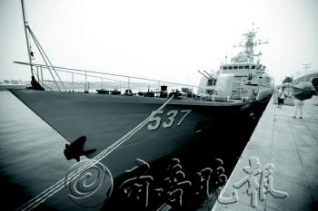 25日,两艘舰船停泊在奥帆中心码头。作为2013中国青岛国际海洋节军事板块的重要部分,537导弹护卫舰和海巡11号海事巡逻船将向游人免费开放,开展国防教育活动。开放时间为27日——28日。