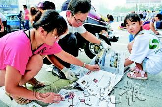记者 王震 摄 |  | ▼一家人合作插报纸,小报童的爸爸还带上手套,看上去很专业。