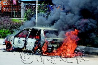 25日上午10时41分,文登葛家镇华塔集团门口,一白色夏利轿车自燃。文登消防大队龙山中队7名消防官兵赶到现场时,轿车已被大火吞噬,幸无人员被困。消防队员用水枪救火,车仍被烧得只剩铁架子。