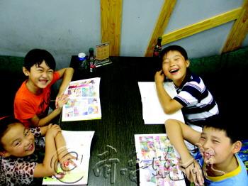 25日,来自淄川农村的王梓晗、王元梁和张店的张庆宇、刘炳骏在书店里边看书边聊天。当天参加“用爱圆梦·不一样的暑假”大型公益活动的10名孩子,进行了文化之旅,走进山东理工大学、市博物馆、市陶瓷馆等,感受城市的历史文化积淀。 本报记者 李超 摄影报道