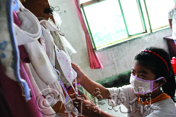 | 月月患病后体质一直比较弱,为此父母给她准备了多个口罩。