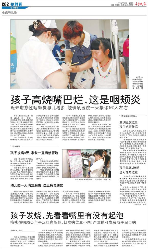 近来疱疹性咽颊炎患儿增多,毓璜顶医院一天接诊160人左右
