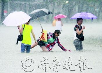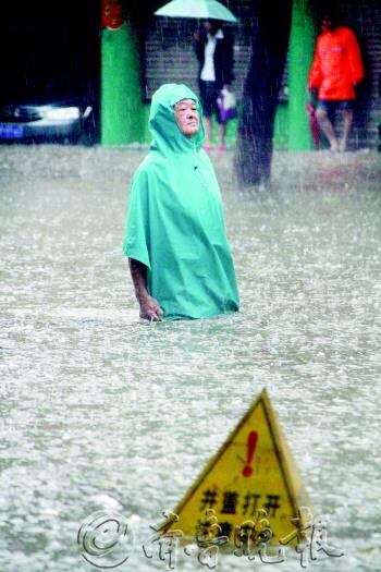 |  | |  | 聊城利民路积水严重,最深处超过1米。一名市民从一个警示牌前小心翼翼地经过。 本报记者 李军 摄 |  | 大雨暂停时,几名小伙子站在马路中央的护栏上歇脚。 本报记者 邹俊美 摄