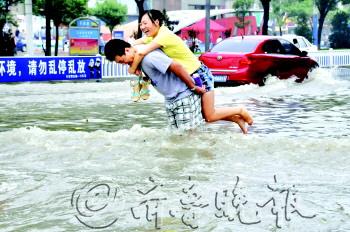 | 聊城利民路上,一名女孩的凉鞋差点被冲走。