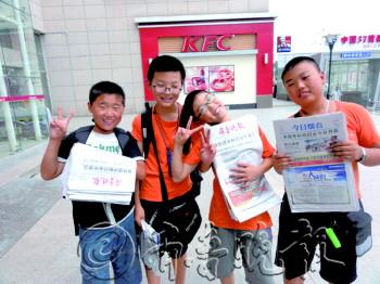 邢博闻、黄传欣、姜涵、王晓宇(从左到右)来自不同的学校,因为本报暑期营销秀结识并成为了好朋友,他们每天在一起卖报纸,除了互相帮助还互相比拼。