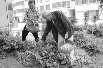 | 油篓村新村的一栋别墅门前长满了野草,其主人已经很久没有回来过。 |  | 年轻人都外出工作,农活只能依靠留守的老人。图为两位老人正在采摘金银花。 |