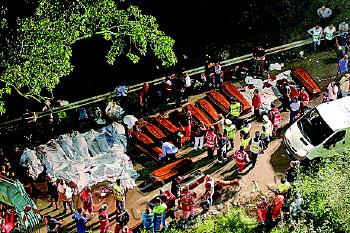 29日,救援人员在车祸现场处置遇难者遗体。 新华/路透