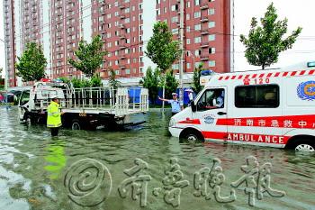 29日下午3时许,一辆救护车在白马山南路上被淹熄火。市中交警大队济微中队调来一辆清障车,将救护车拖离。 本报记者 董钊 实习生 单朴 摄
