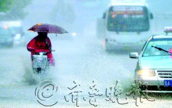 29日,在济南市经十路上,车辆经过路面积水溅起一米多高的水花。当日下午两点半左右济南迎来强降雨,马路成河。