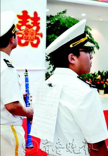 自述:婚宴上的乐队,后排的人将乐谱夹在前排队友身上。
