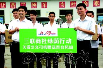 酷暑来临,济南夏天动辄在35℃以上的高温让人备受煎熬。炎炎夏日,我们更应该关爱高温下的一线工作者。为呼吁整个社会关注高温环境下工作的群体,在炎炎夏日送上清凉,由三联商社联合多家媒体共同发起倡议的“绿荫行动”于7月29日正式启动。活动期间,三联商社将开展“为济南公交司机赠送车载电风扇”、为“个体商贩赠送太阳伞”,“为出租车司机赠送精美环保水杯及矿泉水”等关爱高温工作群体的公益活动。 据了解,8月9日,恰逢三联商社29周年店庆,此次公益行动也是为了回馈济南人民的厚爱,三联商社相关负责人表示,作为一个济南本土企业,29年来,三联商社始终坚持每走一步首先想到的是顾客的服务理念,同时,也呼吁更多人能够关注高温下的工作群体。
