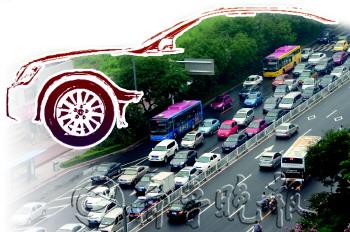 | 上下班高峰时,市区道路上排起长长的车队。 本报记者 孙国祥 摄 |
