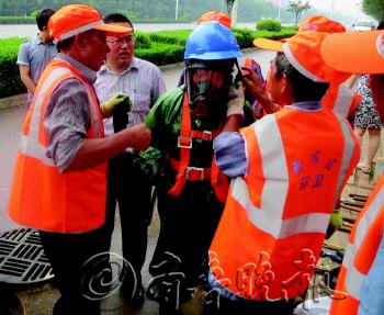 29日,青岛开发区市政养护二公司正在组织管道工人进行井下清掏作业防中毒演练。据悉,随着气温升高,管道工人作业时中毒风险增大,青岛开发区市政养护二公司添置专业下井防毒设备,以确保工人井下作业安全。