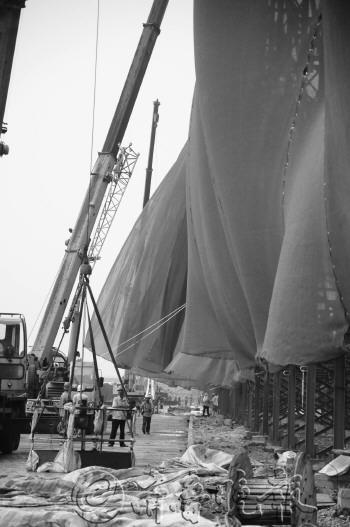 | 29日下午,日照港八号门,防风抑尘墙正在建设中。