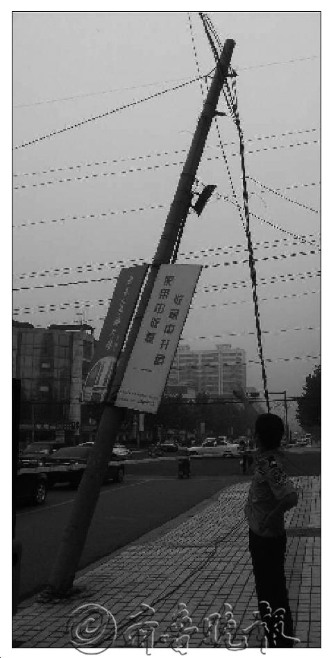 本报7月28日讯(见习记者 郭延冉) 26日下午,读者李先生拨打本报热线反映,莱芜鹏泉东大街与万福南路交汇的十字路口东侧,两根电线杆子倾斜了,即将歪倒,电线杆子撑起的线缆垂挂在路口处,过往车辆都得小心翼翼通过,十分危险。 26日下午4时许,记者赶到现场,看到7根线缆耷拉在路口中间,最低处距路面仅2米左右。路口过往的小轿车通过无碍,但公交车及大货车通过时,很容易触碰到耷拉着的线缆。路口东侧,一根水泥电线杆子底部已经折断,路出钢筋,另外一根电线杆子倾斜得更厉害,几乎倒在路面上。线杆附近的人行便道已经被拉上了警戒线。 警戒线附近,记者见到了莱芜市公安局城东派出所的民警。一朱姓民警说,上午9点左右,一辆大货经过此路口,由于货车装载的货物过高,勾到了路口上方的线缆,随后拽倒了路口东侧两根水泥电线杆,搭在电线杆上的线缆随之垂落到了地面上。9时11分,城东派出所接警,到路口把垂落到地面上的线缆拽起,用一个木棍支撑起来,暂时疏通了此路口的交通,并在现场倾斜的电线杆附近拉起警戒线,维持现场安全。“现在拽住两根电线杆的只有一根视频线,线杆随时可能倒塌。鹏泉大街是城乡交通的主干道,过往的车辆尤其是城乡公交非常多,一旦线杆倒塌,就非常危险。” 民警拨打了移动公司、联通公司以及电力公司、城管执法局、建委市政管理科等单位要求过来查看情况并清除安全隐患,但一直无人来现场。据了解,经移动公司工作人员现场确认,被拽落的线缆中有3根是他们公司的通讯线缆,检测过后,工作人员当即改了线路。而联通公司等单位则称此处无他们的线缆。 “打了一天的电话,倾斜的电线杆子就是无人认领,更没有人管。我们没有专门的工具来放倒这两根随时可能倒塌的危险电线杆,更不能随便剪除线缆,造成城市通讯故障我们都付不起责任。”朱姓民警说。 29日,记者从莱芜市公安局城东派出所了解到,路口两根危险电线杆在公安局领导的协调下,已于28日被放倒在路面上。其中倒在莱商银行门口的一根已经运走,另外一根还在原处。记者赶往现场发现,路口处垂落的线缆已被简单处理,暂时不会影响交通。