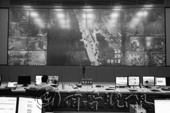| 张店交警大队指挥控制中心值班民警通过交通指示屏监控易积水路段,并指挥现场民警引导交通。 本报记者 崔洋洋 摄 |