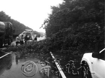 本报7月29日讯(记者 罗静 通讯员 马化目) 29日下午,淄博再次迎来短时暴雨天气。由于连日来的降雨,济青高速路边的两棵杨树因土壤松动而发生倾倒,阻塞了济青高速青岛方向的道路。 据了解,29日下午,淄博再次迎来了一场暴雨,16时15分左右,济青高速K287+500青岛方向,有两颗杨树突然倒在了高速公路上。据观察,两棵杨树高有18米,倾倒后占据了应急车道和行车道。过往车辆只能从超车道缓慢通过,时速仅20公里左右。 济青高速淄博路政大队的工作人员接到通知后立即赶往现场,并联合养护人员用锯锯断大树。一小时之后,到达该处的车辆已可顺利同行。 据工作人员介绍,由于近日降雨多,导致大树根部的泥土松软,加上今天下雨时伴有大风,所以才导致了这两颗树倾倒在济青高速上。