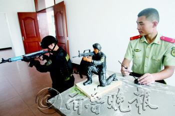 | 一名战士根据真人形象制作面塑作品。 本报记者 赵金阳 摄 |  | |
