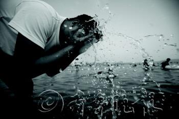 张晓鹏 摄 |  | 天气太热,救生员孙琦用海水洗头降温。