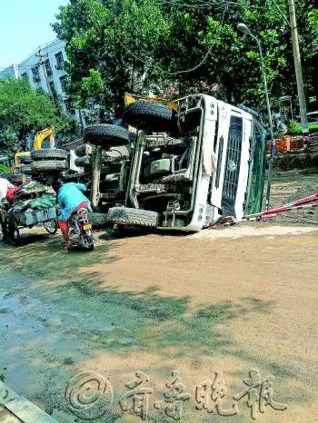 8月1日下午2点左右,和平路与历山东路交叉口,一辆混凝土搅拌车发生侧翻,倒在和平路施工工地约一米深的沟内。施工人员介绍,由于车辆停在了挖开的沟边,车轮下的泥土被轧松动,导致车辆侧翻。所幸事故并未造成人员伤亡。
