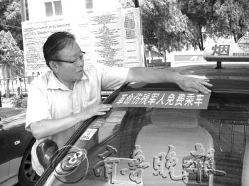 烟台公交集团出租汽车公司20余年拥军不间断。今年8月,又将有80辆出租车参加“革命伤残军人免费乘车”活动。从8月1日至31日,凡革命伤残军人持证乘车,将享受基本价格内的免费服务。图为驾驶员张贴“革命伤残军人免费乘车”标志。
