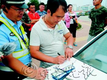 本报热线6610123消息(记者 于飞 通讯员 袁圣凯 李娜 杨应勤) 开车在路上看到有行人要过马路,你会减速礼让,还是争道抢行?8月1日,烟台交警四大队民警对驾驶员开出第一张不礼让行人罚单。一天路查下来,共有37名驾驶员因为没有避让行人受罚,每人罚款50元,记扣驾驶证3分。 1日上午,烟台交警四大队的执勤民警来到迎春大街芳华园路口进行路查。据介绍,因为这个路口周围有银座、芳华园等购物商场,还有集市,所以人流车流都比较多。但这个路口没有交通信号灯,如果机动车不礼让行人,很容易发生事故。为了在社会上倡导文明礼让之风,更为创建文明城市增色添彩,民警特意在该路口进行现场执法,对没有礼让行人的驾驶员进行处罚。 上午10点左右,一辆白色标致307在迎春大街上从北向南驶来,正在这时,一位行人从路东向西准备过马路。走在斑马线上的时候,这辆标致307正好从他身边开了过去,丝毫没有减速礼让的意思。这一切都被在路边执勤的民警用执法记录仪记录了下来,此车没走多远,就被民警拦下了。 “知不知道为什么把你拦下?”民警问驾驶员。驾驶员杨先生一脸雾水地回答道:“不知道。”民警拿出中华人民共和国交通道路安全法手册,向他讲解,不避让行人也属于违法行为,罚款50元,并扣驾驶证3分。 据了解,这是烟台对驾驶员开出的第一张不礼让行人的罚单。当天一共有37名驾驶员因没有避让行人被交警部门处罚,每人罚款50元,记扣驾驶证3分。 交警四大队一中队中队长薛强介绍,机动车、非机动车和行人都是交通活动参与者,然而行人却属于其中的最弱者,一旦发生事故,无论是谁的责任,受伤最严重的肯定是行人,所以机动车一定要礼让行人。记者从交警部门了解到,对不礼让行人的机动车进行处罚,此后将成为长效机制,还会对被查获的车辆信息进行曝光,把车号牌曝光到市区各处曝光台。 被罚驾驶员在罚单上签字。 本报记者 于飞 摄