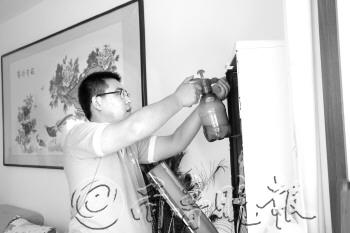 | 杨斌正在清洗空调内部的灰尘。 本报记者 于涛 摄 |  | “嘿,空调清洗完确实凉快多了!”