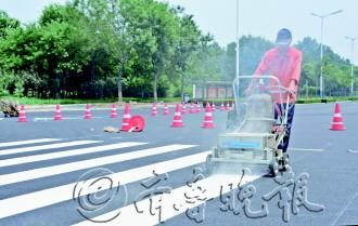 随着世昌大道路面施工的结束,交警部门抓紧对交通标线进行重新施划。图为1日上午,施工人员在世昌大道与文化西路交叉口施划斑马线,预计在8月中旬全部完工。