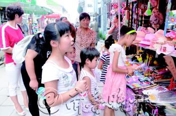 | 五名小朋友惊喜地看着周村古商城大街上各式各样的商品。 本报记者 姜文洁 摄 |