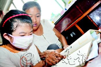 | 月月已经8岁了,一直没有上学,姐姐成了她的老师。 本报记者 王鸿哲 摄 |