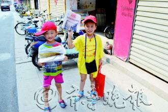 本报枣庄8月1日讯(记者 杨霄) 年仅8岁的田鑫源在本次“枣庄银行幸福杯”齐鲁晚报天天向上暑期营销秀活动中,已经开始带实习生,这位小老师对待拜师学员可是很“挑剔”。 1日上午,记者在中天步行街见到了正在卖报的田鑫源和6岁“实习生”宗新皓。“今天我带的实习生是宗新皓,看见没,他是个小帅哥,我相信他能学的很快。”说起话来,田鑫源像个小大人,“前两天我也带过一个实习生,是个小女孩,太娇气了,我不愿再教她了。看到一家网吧,田鑫源为了给实习生示范,毅然决然走了进去,可是被网管送了出来。小老师很纳闷,“网吧里那么多人,怎么会没人买?一看都不爱学习。”然后在小老师的建议下,两人一起走进了一家干洗店。实习生看着小老师成功售出一份报纸,羡慕极了。 看到小老师连着销售成功四五份报纸后,实习生决定自己尝试。初战告捷,让宗新皓信心倍增,几乎没有会拒绝他们的顾客。 上午刚过十点,两人的报纸卖完了。“明天你自己卖吧,经鉴定可以‘出师’了。”田鑫源说。