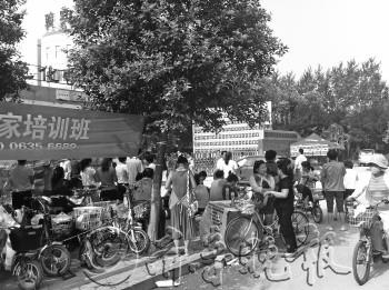 | 7月31日,在东昌府区事业编招考笔试考点外,满是各类面试培训机构的招生摊点。 本报记者 张跃峰 摄 |